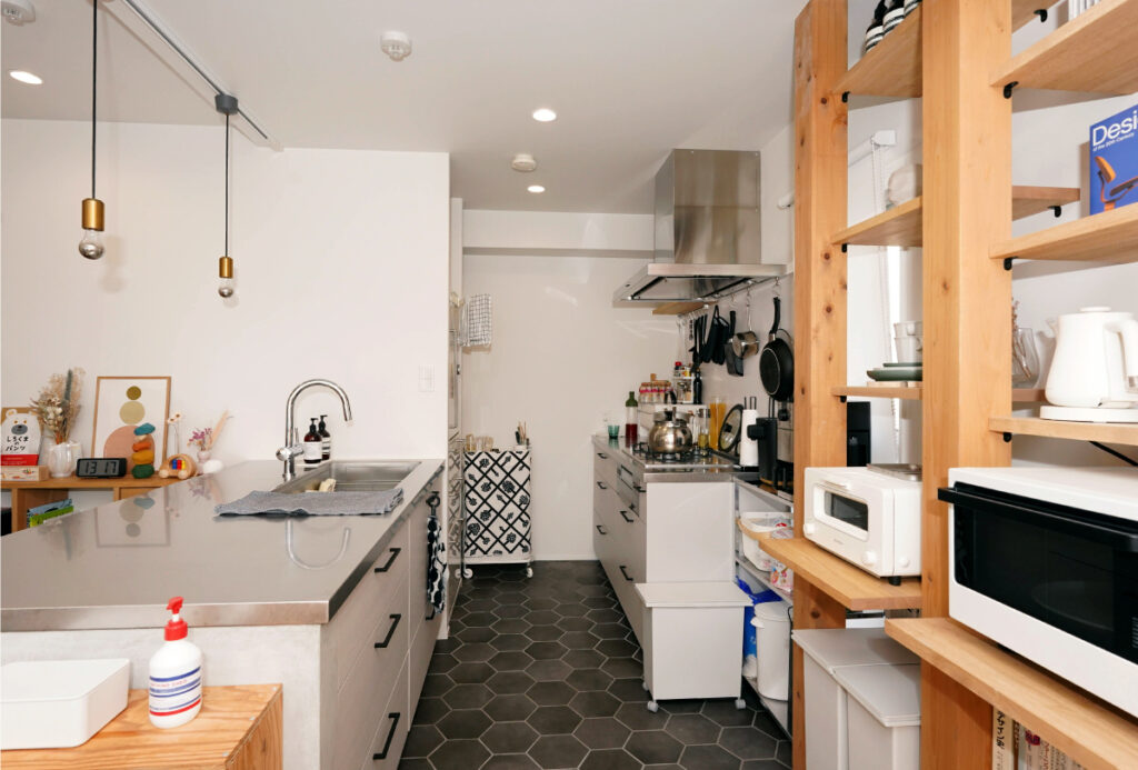 そこで好みに近い物件を手がけるリノベーション会社を探し、物件探しからスタート。理想に近づけるべく、スケルトンにして空間を一から構築した。写真や資料を見せながら、何度も打ち合わせを行ったそうだ。春花さんが特にこだわったのは、シンクとコンロのキャビネットが並列しているII型のキッチン。