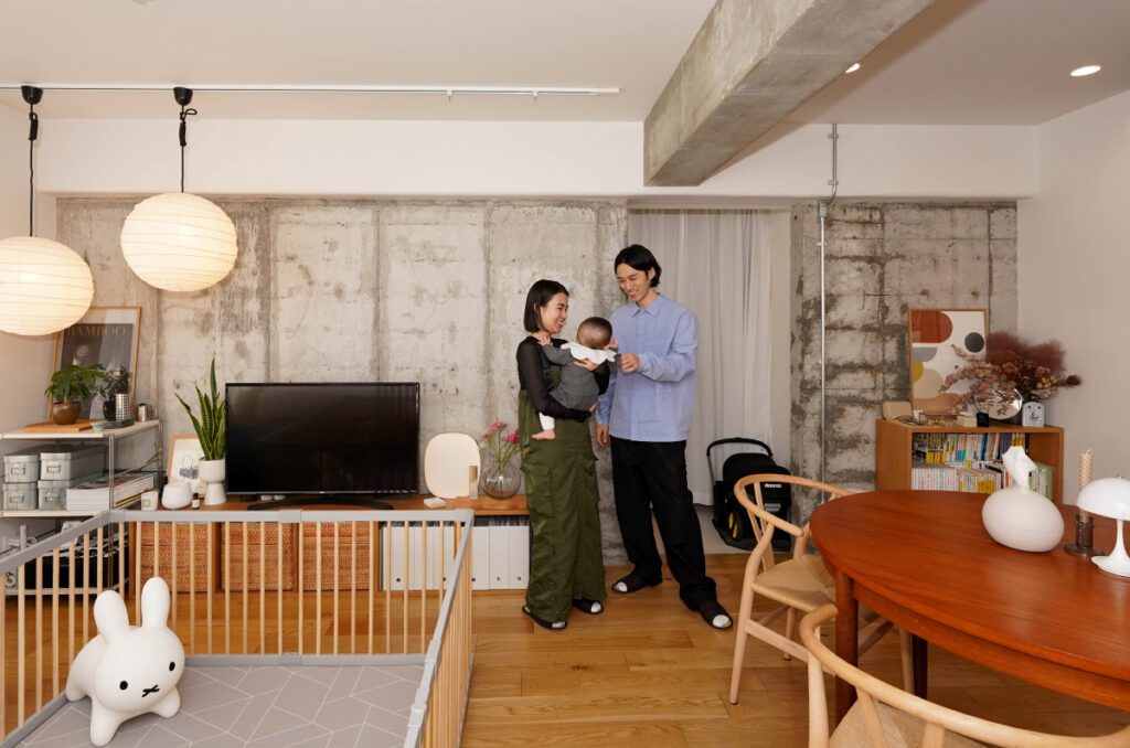 中古マンションをリノベーションしてつくられた家には、厳選された家具や照明、土間のある玄関など2人のこだわりがつまっている。そこには、仕事・家事・育児を楽しく快適にするための工夫も。その都度話し合いながら、住まいのイメージを固めていったという2人。どのようにして、家族が心地よく暮らす空間をつくりあげていったのだろうか。