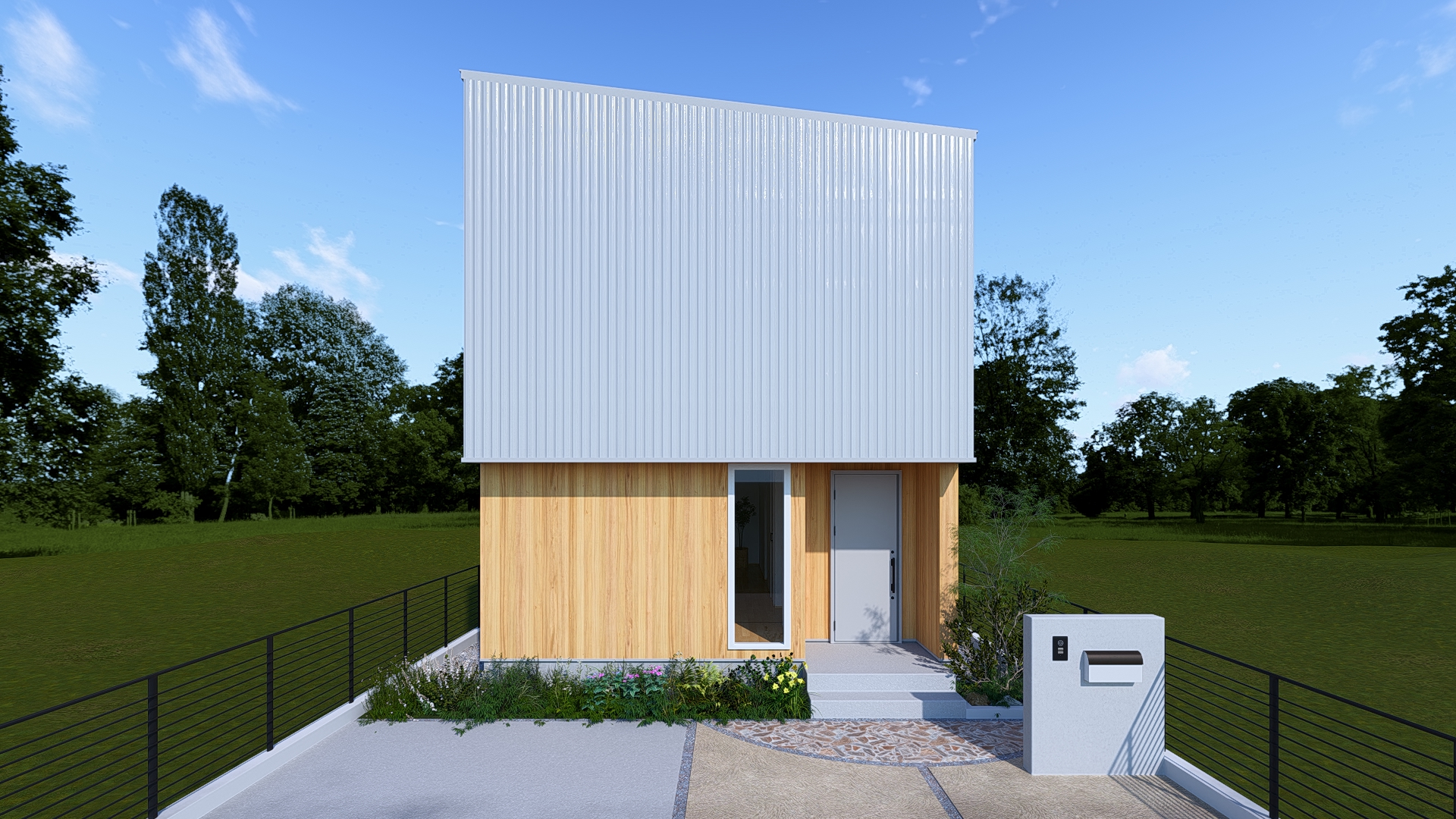 白のガルバリウムと天然木が調和する、シンプルナチュラルな外観