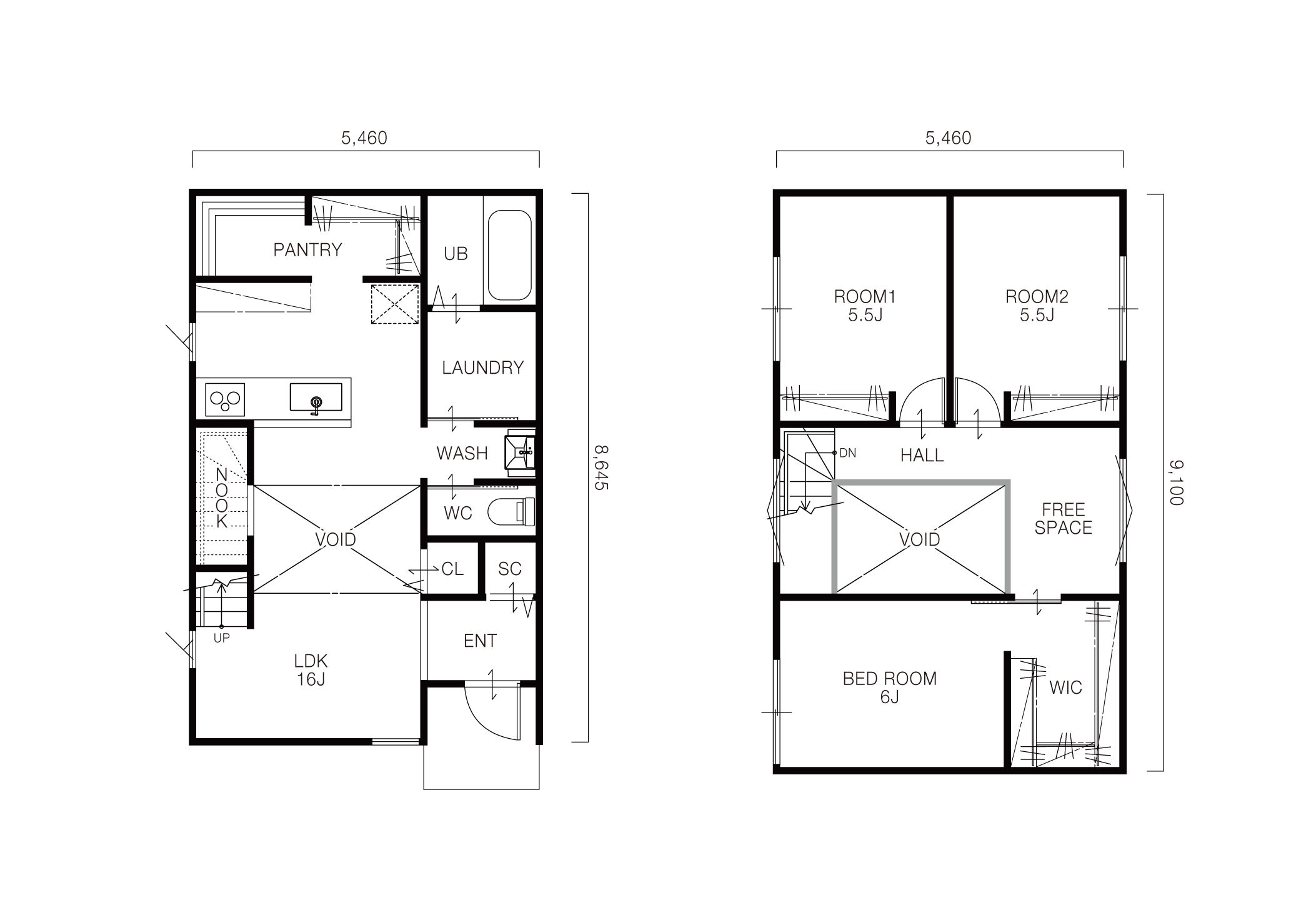 吹き抜けでつながる2階フロアには、大容量のWICを備えた寝室と5.5帖の洋室2部屋を完備。